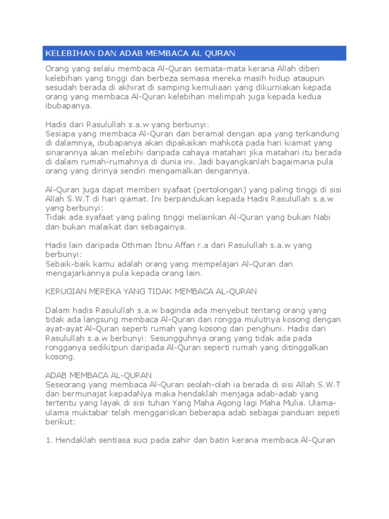 Fadhilah Membaca Dan Mengamalkan Al Quran Beserta Adab Adab