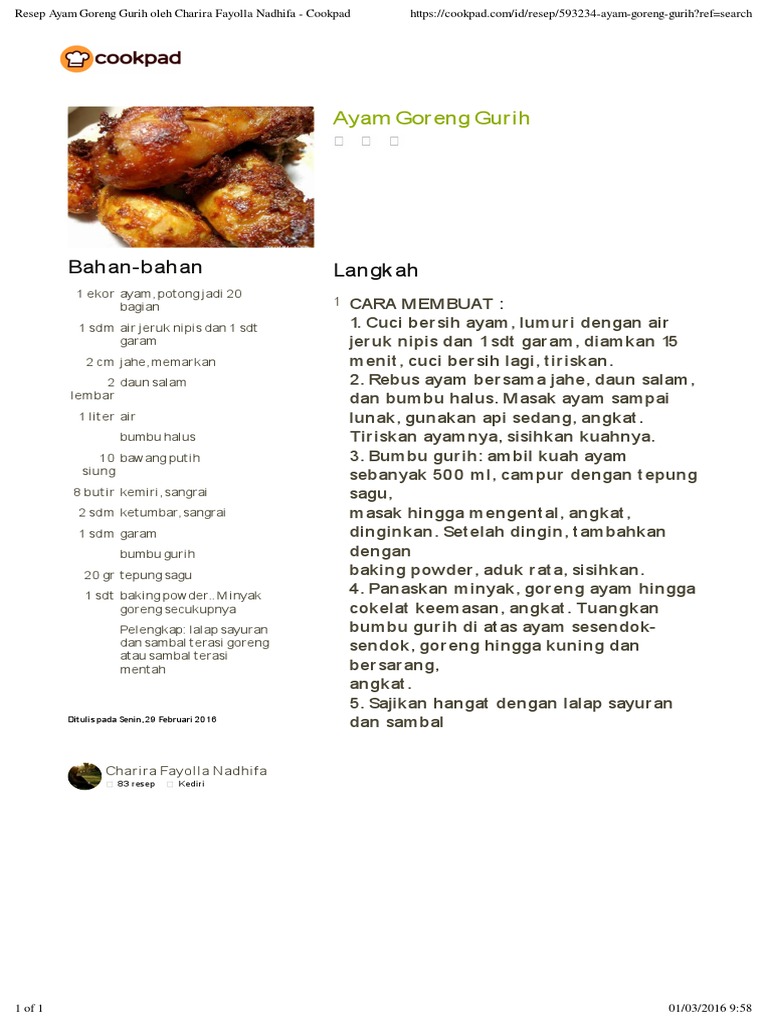 Resep Ayam Goreng Gurih Oleh Charira Fayolla Nadhifa Cookpad Pdf