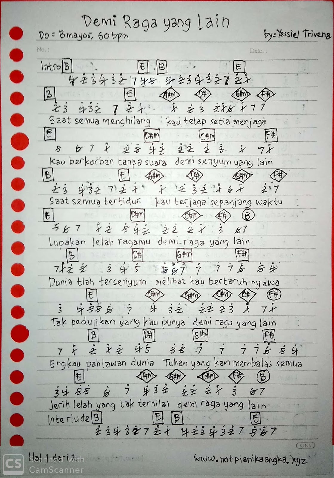 Not Angka Lagu Demi Raga Yang Lain Yessiel Trivena