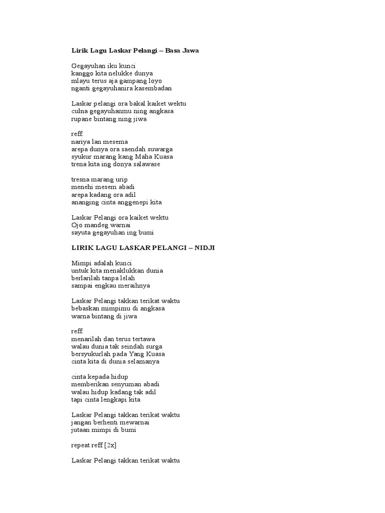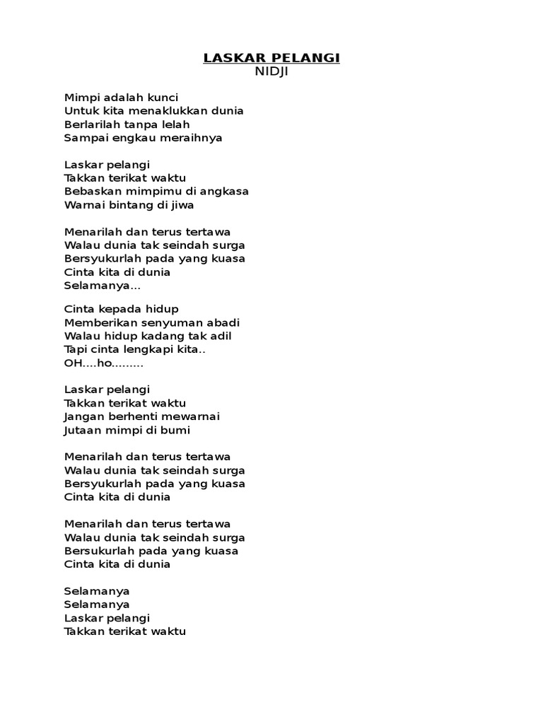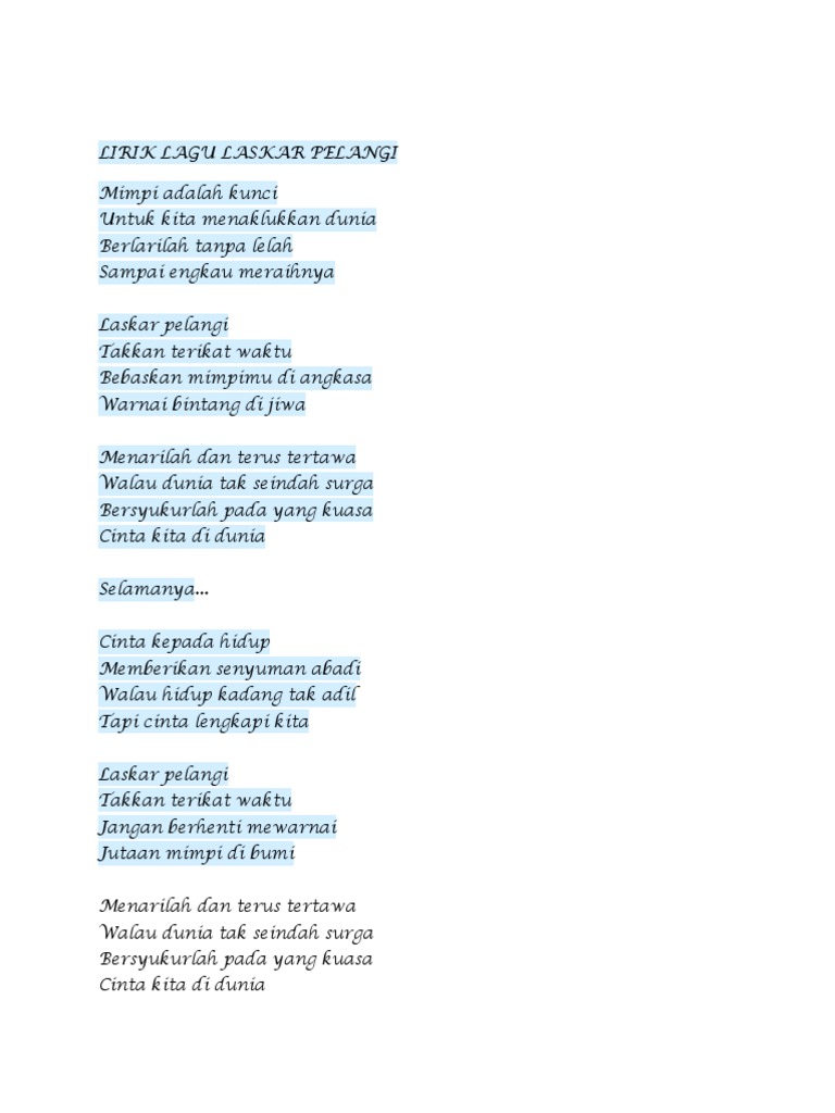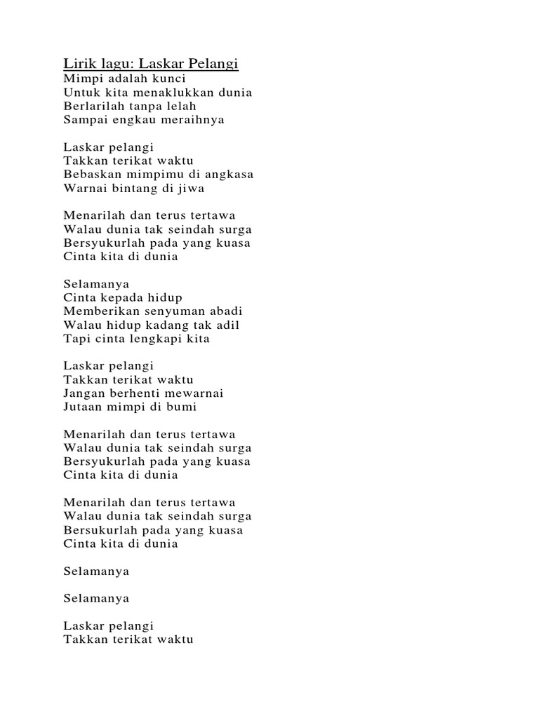 Laskar Pelangi Docx Lirik Lagu Laskar Pelangi Mimpi Adalah Kunci Untuk Kita Menaklukkan Dunia Berlarilah Tanpa Lelah Sampai Engkau Meraihnya Laskar Course Hero