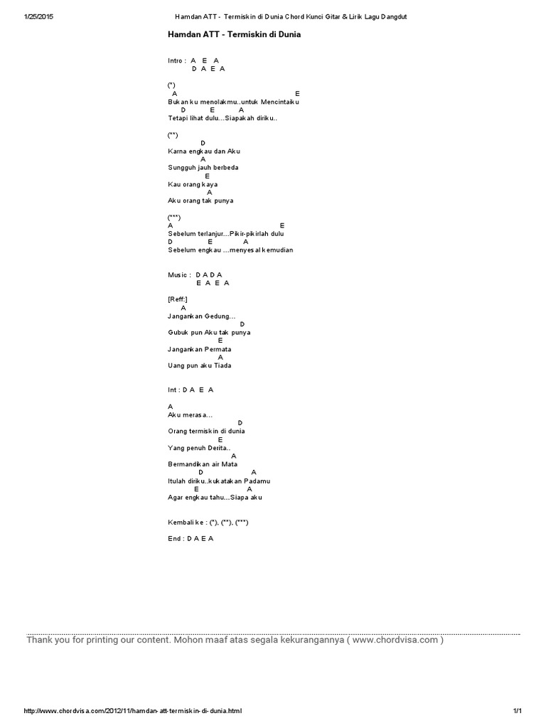 Chord Gitar Dan Lirik Lagu Termiskin Di Dunia Hamdan Att